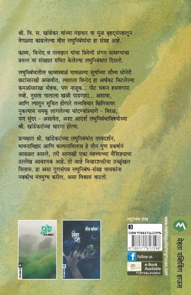 THIS IS A SET OF TWENTY SHORT ESSAYS FROM THE VAST COLLECTION OF ESSAYS BY THE EMINENT AUTHOR. THE TOPICS ARE A COMBINATION OF POETRY, HUMOUR AND PHILOSOPHY. KHANDEKAR HAD HIS OWN ASSUMPTIONS ABOUT THE NATURE OF SHORT ESSAYS. HE BELIEVED IN JUST A TOUCH OF HUMOUR WITH LITTLE BIT OF POETIC LANGUAGE AND TRACE OF PHILOSOPHY. HE WAS A MAN OF FEW WORDS LOADED WITH DEEP MEANING. HIS ESSAYS ARE GENERALLY A MIXTURE OF IMAGINATION, FEELINGS AND THOUGHTS. IN HIS MIND'S EYE, HE ALLOWS HIS IMAGINATION TO RUN FAR AND WIDE. READING HIS ESSAYS WILL BE A TREAT TO MIND AND EYES.