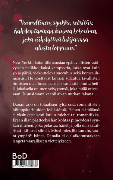 Vaarallinen, synkkä, seksikäs. Kahden tarinan kuuma kokoelma, joka viihdyttää lukijaansa alusta loppuun. New Yorkin laitamilla asustaa epätavallisten ystävysten nelikko; kaksi vampyyria, jotka ovat kuin yö ja päivä, viekoitteleva succubus sekä komea ihmissusi. He koettavat kovasti sulautua tavallisten ihmisten maailmaan ja elää osana sitä, mutta heillä jokaisella on menneisyytensä, joka pitää otteessaan. Ja uusi vaara vaanii aivan nurkan takana. Danan arki on totaalisen tylsä sekä romanttisten hömppätarinoiden kyllästämä. Hänen elämäänsä ei yksinkertaisesti kuulu miehet tai romantiikka. Erään illan päätteeksi hän kohtaa pimeydessä synkän miehen, joka pelastaa hänet ja jolla on vaarallisesti kiiluvat silmät. Missä mies liikkuukin, vaara ympäröi hänet. Danalla ei ole aikomustakaan langeta vaaralliseen viettelykseen.