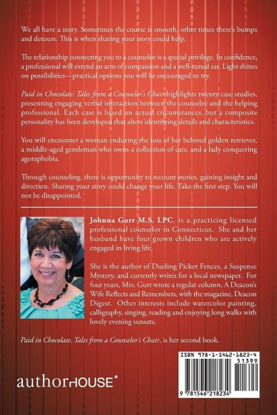 Johnna Gurr M.S. LPC, is a practicing licensed professional counselor in Connecticut. She and her husband have four grown children who are actively engaged in living life. She is the author of Dueling Picket Fences, a Suspense Mystery, and currently writes for a local newspaper. For four years, Mrs. Gurr wrote a regular column, A Deacons Wife Reflects and Remembers, with the magazine, Deacon Digest. Other interests include watercolor painting, calligraphy, singing, reading and enjoying long walks with lovely evening sunsets. Paid in Chocolate, Tales from a Counselors Chair, is her second book.