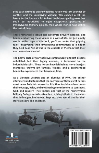 Step back in time to an era when the nation was torn asunder by conflict, and the unforgiving Vietnam War exacted a toll too heavy for the human spirit to bear. In this compelling narrative, you'll be introduced to eight exceptional graduates of Pennsylvania Military College, men whose stories have defied the test of time. These remarkable individuals epitomize bravery, heroism, and honor, embodying these values as a way of life, not just empty words. In the pages of this book, you'll encounter their gripping tales, discovering their unwavering commitment to a nation they held dear. Yet, it was in the crucible of Vietnam that their mettle was truly tested. The heavy price of war took lives prematurely and left dreams unfulfilled, but their legacy endures, a testament to the indomitable spirit. These heroes have left behind more than just memories; they've left families, friends, and a brotherhood bound by experiences that transcend time. As a Vietnam Veteran and an alumnus of PMC, the author intimately understands that the sacrifices of these eight heroes must never fade into obscurity. It is time to shine a beacon on their courage, valor, and unwavering commitment to comrades, God, and country. Their legacy, and that of the Pennsylvania Military College, remains steadfast, a living tribute to the values that define genuine heroes. Step into their world, and let their stories inspire and enlighten.