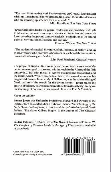Werner Jaeger's classic three-volume work, originally published in 1939, is now available in paperback. Paideia, the shaping of Greek character through a union of civilization, tradition, literature, and philosophy is the basis for Jaeger's evaluation of Hellenic culture. Volume I describes the foundation, growth, and crisis of Greek culture during the archaic and classical epochs, ending with the collapse of the Athenian empire. The second and third volumes of the work deal with the intellectual history of ancient Greece in the Age of Plato, the 4th century B.C.--the age in which Greece lost everything that is valued in this world--state, power, liberty--but still clung to the concept of paideia. As its last great poet, Menander summarized the primary role of this ideal in Greek culture when he said: "The possession which no one can take away from man is paideia."