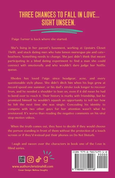 Three chances to fall in love...sight unseen. Paige Turner is back where she started. She's living in her parent's basement, working at Upstairs Closet Thrift, and stuck dating men who hate lemon meringue pie and cats-heathens. Something needs to change. She just didn't think that meant participating in a blind dating experiment to find a man she could connect with emotionally and who wouldn't dare judge her Netflix queue. Rhodes has loved Paige since headgear, acne, and every questionable style phase. She didn't ditch him when his legs grew at record speed one summer, or when his dad's stroke took longer to recover from, and he needed a shoulder to lean on, even if it did mean he had to bend over to reach it. Their history is murky with friendship, but he promised himself he wouldn't squash an opportunity to tell her how he felt the next time she was single. Concealing his identity to compete with two other guys for her attention wasn't what he envisioned. It's worse than reading the negative comments on his viral stop-motion videos. When the truth comes out, they have to decide if they would choose the person standing in front of them without the protection of a touch screen or if they'd rather put their phones on Do Not Disturb.