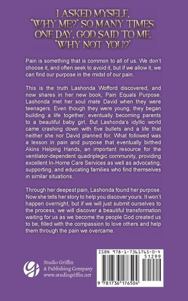 Pain is something that is common to all of us. We don't choose it, and often seek to avoid it, but if we allow it, we can find our purpose in the midst of our pain. This is the truth Lashonda Wofford discovered, and now shares in her new book, Pain Equals Purpose. Lashonda met her soul mate David when they were teenagers. Even though they were young, they began building a life together, eventually becoming parents to a beautiful baby girl. But Lashonda's idyllic world came crashing down with five bullets and a life that neither she nor David planned for. What followed was a lesson in pain and purpose that eventually birthed Akins Helping Hands, an important resource for the ventilator-dependent quadriplegic community, providing excellent In-Home Care Services as well as advocating, supporting, and educating families who find themselves in similar situations. Through her deepest pain, Lashonda found her purpose. Now she tells her story to help you discover yours. It won't happen overnight, but if we will just submit ourselves to the process, we will discover a beautiful transformation waiting for us as we become the people God created us to be, filled with the compassion to love others and help them through the pain we overcame.