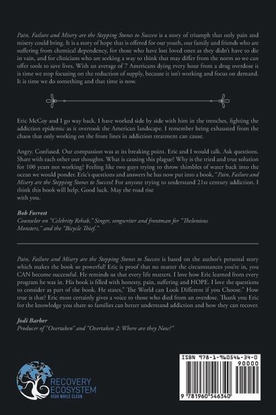 Pain, Failure and Misery are the Stepping Stones to Success is a story of triumph that only pain and misery could bring. It is a story of hope that is offered for our youth, our family and friends who are suffering from chemical dependency, for those who have lost loved ones as they didn't have to die in vain, and for clinicians who are seeking a way to think that may differ from the norm so we can offer tools to save lives. With an average of 7 Americans dying every hour from a drug overdose it is time we stop focusing on the reduction of supply, because it isn't working and focus on demand. It is time we do something and that time is now.* * * * * Eric McCoy and I go way back. I have worked side by side with him in the trenches, fighting the addiction epidemic as it overtook the American landscape. I remember being exhausted from the chaos that only working on the front lines in addiction treatment can cause. Angry. Confused. Our compassion was at its breaking point. Eric and I would talk. Ask questions. Share with each other our thoughts. What is causing this plague? Why is the tried and true solution for 100 years not working? Feeling like two guys trying to throw thimbles of water back into the ocean we would ponder. Eric's questions and answers he has now put into a book, "Pain, Failure and Misery are the Stepping Stones to Success! For anyone trying to understand 21st century addiction. I think this book will help. Good luck. May the road rise with you. Bob Forrest Counselor on "Celebrity Rehab," Singer, songwriter and frontman for "Thelonious Monsters," and the "Bicycle Thief." Pain, Failure and Misery are the Stepping Stones to Success is based on the author's personal story which makes the book so powerful! Eric is proof that no matter the circumstances you're in, you CAN become successful. He reminds us that every life matters. I love how Eric learned from every program he was in. His book is filled with honesty, pain, suffering and HOPE. I love the questions to consider as part of the book. He states," The World can Look Different if you Choose." How true is that? Eric most certainly gives a voice to those who died from an overdose. Thank you Eric for the knowledge you share so families can better understand addiction and how they can recover. Jodi Barber Producer of "Overtaken" and "Overtaken 2: Where are they Now?"