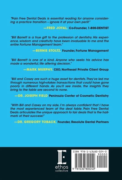 Even seasoned dentists can be overwhelmed by a practice purchase, sale or partnership. And with good reason - even when executed properly, the stakes are high, disaster can be just around the corner, and unique emotional, financial and legal issues often rear their ugly head. In Pain Free Dental Deals, Bill Barrett and Casey Gocel demystify the process of buying, selling, or merging a practice in order to uncover the smoothest and most profitable path forward.