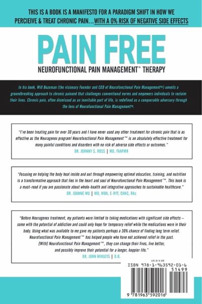 "A must-read if you are passionate about whole-health and the integrative approaches to sustainable healthcare." -Dr.Joanne Wu, MD, MBA, E-RYT, CHHC, RAc In his book Will Bozeman, visionary founder and CEO of Neuragenex unveils a groundbreaking approach to chronic pain, and that challenges conventional norms and empowers individuals to reclaim their lives. Chronic pain, often dismissed as an inevitable part of life, is redefined as a conquerable adversary through the lens of Neurofunctional Pain Management¿. This book is a manifesto for a paradigm shift in how we perceive and treat chronic pain, with a 0% risk of negative side effects.