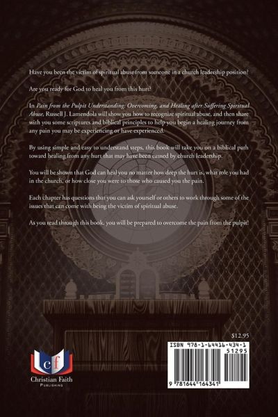 Have you been the victim of spiritual abuse from someone in a church leadership position? Are you ready for God to heal you from this hurt? In Pain from the Pulpit Understanding: Overcoming, and Healing after Suffering Spiritual Abuse, Russell J. Lamendola will show you how to recognize spiritual abuse, and then share with you some scriptures and biblical principles to help you begin a healing journey from any pain you may be experiencing or have experienced. By using simple and easy to understand steps, this book will take you on a biblical path toward healing from any hurt that may have been caused by church leadership. You will be shown that God can heal you no matter how deep the hurt is, what role you had in the church, or how close you were to those who caused you the pain. Each chapter has questions that you can ask yourself or others to work through some of the issues that can come with being the victim of spiritual abuse. As you read through this book, you will be prepared to overcome the pain from the pulpit!