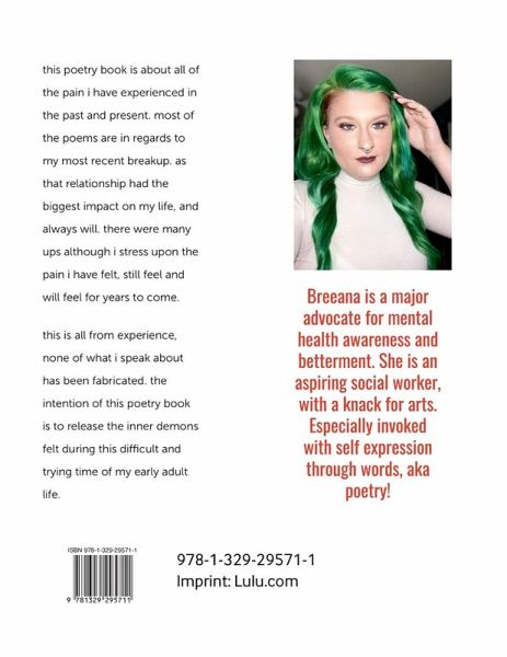 this poetry book is about all of the pain i have experienced in the past and present. most of the poems are in regards to my most recent breakup. as that relationship had the biggest impact on my life, and always will. there were many ups although i stress upon the pain i have felt, still feel and will feel for years to come.