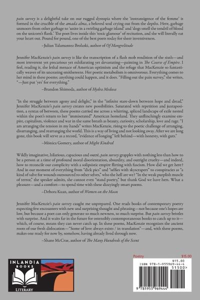 A sardonic burlesque with "the intransigence of the femme," Pain Survey plumbs queer desire and strips American necropolitics down. Both a cross-examination of a global war economy and a celebration creaturely belonging, the book collates the stuff of daily casual hells nested in their denial while insisting that shrapnel wounds can be healed as "metal works its way out". In lyric reportage from across Istanbul, Damascus, Beirut, and New York City, the book finds the ghosts of other imperial exploits haunting this century's "forever wars". From tombstones turned ballistic weapons in Britain's defeat of the Spanish Armada to the stock market mourning the death of George Bush Sr. during Donald Trump's Islamophobic presidency, Pain Survey wrests arresting details from the numbing excess of America's supersized hegemony to indict both the pain produced and its whitewashing optics. It spoofs global capital's relentless replication of its viral avatars while repping its predations as prowess: "Exchange rate porn: as their currency slides rapidly downward / against our very strong dollar. Here come the villas filching water". Against sanitized myths, the book proposes "actually approaching the witness box, the witness / a funnel of fire with a human body at the center. Ask her / What is considered a liberating garment. Why / are there so many paintings of white women looking down". In its "infinite stare-down between hope and dread", it's death wish versus queer glee. Lingering in fugitive communion offered across differences and borders, Pain Survey writes into song the belief that "if we keep searching we can find the balm we need". Gathering the discrete into a fierce, piercing, and exuberant whole, Pain Survey invites the reader to find kinship with doves nesting in pockets formed by shelling and homesick and captive crocodiles' refusal to participate in gladiator contests, to get "plump with joy" even in precarity so as to imagine: "In my paradise/there would be a lot of liquids and could I bask/unabashed in the breathing."