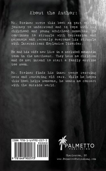Mr. Steiner wrote this book as part of his journey to understand and to cope with his childhood and young adulthood memories. He continues to struggle with depression and paranoia and recently overcame his struggle with Intermittent Explosive Disorder. He and his wife now live in a secluded mountain town in the northeast. They have no children and do not intend to start a family anytime too soon. Mr. Steiner finds his inner peace rescuing cats and restoring old cars. While he hopes this book helps someone, he wants no contact with the outside world.