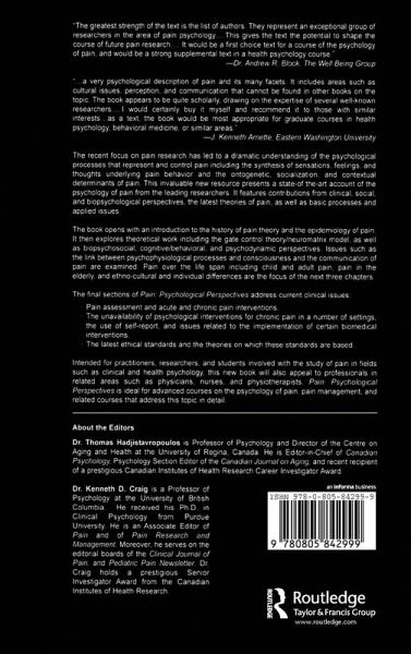 This volume explicates our current understanding of current theory and research on these complex psychological processes. Both clinical (pain assessment and treatment) and basic (eg, consciousness and pain, the neuromatrix model, sociocommunication processes) perspectives are carefully examined by a group of pain researchers and clinicians.