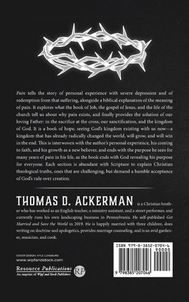 Pain tells the story of personal experience with severe depression and of redemption from that suffering, alongside a biblical explanation of the meaning of pain. It explores what the book of Job, the gospel of Jesus, and the life of the church tell us about why pain exists, and finally provides the solution of our loving Father: in the sacrifice at the cross, our sanctification, and the kingdom of God. It is a book of hope, seeing God's kingdom existing with us now--a kingdom that has already radically changed the world, will grow, and will win in the end. This is interwoven with the author's personal experience, his coming to faith, and his growth as a new believer, and ends with the purpose he sees for many years of pain in his life, as the book ends with God revealing his purpose for everyone. Each section is abundant with Scripture to explain Christian theological truths, ones that are challenging, but demand a humble acceptance of God's rule over creation.