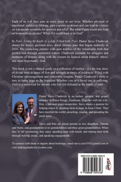 Each of us will face pain at some point in our lives. Whether physical or emotional, sudden or lifelong, pain exposes weakness and can lead its victims on a desperate scramble for answers and relief. But what if pain could also lead us to something greater? What if it could lead us to God? In Pain: Living by Faith in a Life Filled with Pain, Pastor Steve Chadwick shares his deeply personal story about chronic pain that began suddenly in 2016. His years-long journey with pain testifies of the remarkable faith that guided him through uncharted waters. Chadwick recounts his struggles and moments of despair, along with the lessons he learned about himself, others, and most importantly, God. This book is not a clinical guide or a collection of studies-it's the true story of divine trust in times of fear and strength in times of weakness. Filled with Christian encouragement and vulnerable insights, Pastor Chadwick's story is sure to bring hope to the hopeless. Whether you or a loved one is suffering, Pain is a must-read for anyone who has felt defeated at the hands of pain. Pastor Steve Chadwick is an author, speaker, and gospel minister in Baton Rouge, Louisiana. Together with his wife, Rita, a talented singer-songwriter, Steve shares a passion for helping others by pointing them to hope in Jesus Christ. They have traveled the world, preaching, singing, and spreading the good news. Steve and Rita are proud parents to two daughters, Tabitha and Marie, and grandparents to six grandchildren and three great-grandchildren. When they're not ministering, they enjoy spending time with family and sharing their faith through writing, music, and speaking engagements. To connect with them or inquire about bookings, email steve.cem1995@gmail.com or visit ritakingchadwick@yahoo.com.