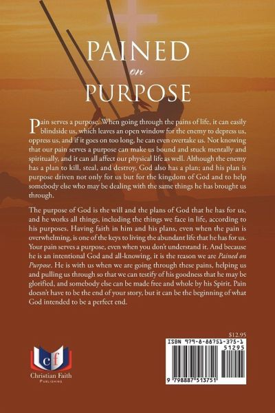 Pain serves a purpose. When going through the pains of life, it can easily blindside us, which leaves an open window for the enemy to depress us, oppress us, and if it goes on too long, he can even overtake us. Not knowing that our pain serves a purpose can make us bound and stuck mentally and spiritually, and it can all affect our physical life as well. Although the enemy has a plan to kill, steal, and destroy, God also has a plan; and his plan is purpose driven not only for us but for the kingdom of God and to help somebody else who may be dealing with the same things he has brought us through. The purpose of God is the will and the plans of God that he has for us, and he works all things, including the things we face in life, according to his purposes. Having faith in him and his plans, even when the pain is overwhelming, is one of the keys to living the abundant life that he has for us. Your pain serves a purpose, even when you don't understand it. And because he is an intentional God and all-knowing, it is the reason we are Pained on Purpose. He is with us when we are going through these pains, helping us and pulling us through so that we can testify of his goodness that he may be glorified, and somebody else can be made free and whole by his Spirit. Pain doesn't have to be the end of your story, but it can be the beginning of what God intended to be a perfect end.