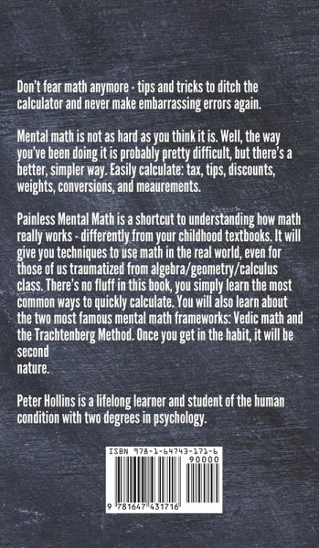 Stop fearing math - tips and tricks to ditch the calculator and never make embarrassing errors again. Mental math is not as hard as you think it is. Well, the way you've been doing it is probably pretty difficult, but there's a better, simpler way. Easily calculate: tax, tips, discounts, weights, conversions, and meaurements. Painless Mental Math is a shortcut to understanding how math really works - far differently from your childhood textbooks. It will give you techniques to use math in the real world, even for those of us traumatized from algebra/geometry/calculus class. There's no fluff in this book, you simply learn the most common ways to quickly calculate. You will also learn about the two most famous mental math frameworks: Vedic math and the Trachtenberg Method. Once you get in the habit, it will be second nature. Never lose money to miscalculating again! Peter Hollins has studied psychology and peak human performance for over a dozen years and is a bestselling author. He has worked with a multitude of individuals to unlock their potential and path towards success. His writing draws on his academic, coaching, and research experience. Complex calculations and equations made simple - your friends will be amazed and confused. ¿The cause of math anxiety and hatred. ¿The mindset you need to excel in mental math. ¿The most common everyday math scenarios and how to handle them effortlessly. ¿Vedic math, the Trachtenberg Method, and other frameworks to solve complex equations easily. You'll wish you knew these tips when you were still in school! For many of us, math is a subject of extreme lack of confidence. Maybe you didn't go into a career because it is math-heavy. No more. Transform your thinking by learning a few simple tricks. Face math anywhere and anytime. Feel a sense of freedom and empowerment. Stop being intimidated and start taking charge!
