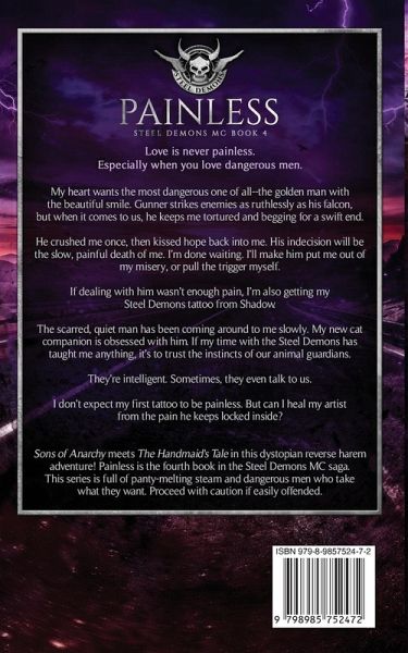 Love is never painless. Especially when you love dangerous men. My heart wants the most dangerous one of all--the golden man with the beautiful smile. Gunner strikes enemies as ruthlessly as his falcon, but when it comes to us, he keeps me tortured and begging for a swift end. He crushed me once, then kissed hope back into me. His indecision will be the slow, painful death of me. I'm done waiting. I'll make him put me out of my misery, or pull the trigger myself. If dealing with him wasn't enough pain, I'm also getting my Steel Demons tattoo from Shadow. The scarred, quiet man has been coming around to me slowly. My new cat companion is obsessed with him. If my time with the Steel Demons has taught me anything, it's to trust the instincts of our animal guardians. They're intelligent. Sometimes, they even talk to us. I don't expect my first tattoo to be painless. But can I heal my artist from the pain he keeps locked inside? Sons of Anarchy meets The Handmaid's Tale in this dystopian reverse harem adventure! Painless is the fourth book in the Steel Demons MC saga. This series is full of kindle-melting steam and dangerous men who take what they want. Proceed with caution if easily offended. Reading order: 1. Lawless 2. Powerless 3. Fearless 4. Painless 5. Helpless 6. Heartless 7. Senseless 8. Ruthless 9. Merciless 10. Endless