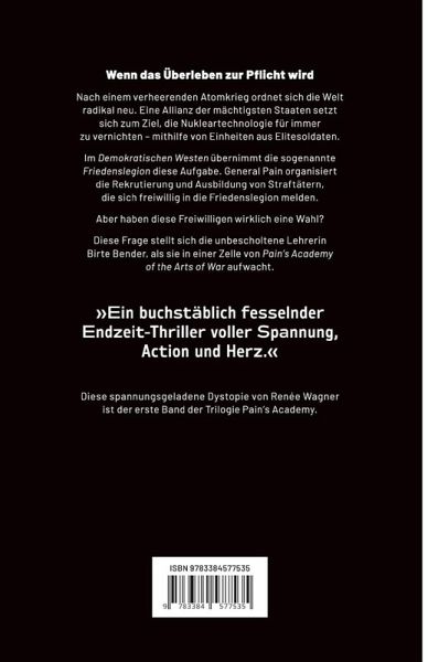 Wenn das Überleben zur Pflicht wird.Nach einem verheerenden Atomkrieg ordnet sich die Welt radikal neu. Eine Allianz der mächtigsten Staaten setzt sich zum Ziel, die Nukleartechnologie für immer zu vernichten - mithilfe von Einheiten aus Elitesoldaten.Im Demokratischen Westen übernimmt die sogenannte Friedenslegion diese Aufgabe. General Pain organisiert die Rekrutierung und Ausbildung von Straftätern, die sich freiwillig in die Friedenslegion melden.Aber haben diese Freiwilligen wirklich eine Wahl?Diese Frage stellt sich die unbescholtene Lehrerin Birte Bender, als sie in einer Zelle in Pain's Academy of the Arts of War aufwacht.Ein buchstäblich fesselnder Endzeit-Thriller voller Spannung, Action und Herz.Diese spannungsgeladene Dystopie ist der erste Band der Trilogie Pain's Academy.Was dich erwartet Eine düstere Zukunftsvision: Die Welt ordnet sich nach einem Atomkrieg politisch und wirtschaftlich neu. Aber die Menschheit kämpft noch ums Überleben. Den Frieden zwischen den Völkern zu bewahren, gestaltet sich schwierig. Immerhin einigen sich die Staaten darauf, in ihren Kriegen die Zivilisten zu schonen. Eine starke Protagonistin: Die Lehrerin Birte Bender wird in ein gnadenloses militärisches Ausbildungslager verschleppt, ihre Identität wird ausgetauscht und sie wird gezwungen, als Soldatin zu handeln und Kameraden zu führen. Doch auch als Offizierin bleibt sie Gefangene dieses unmenschlichen Systems. Moralische Dilemmata: General Pain bedroht die Leben ihres Mannes und ihrer Kinder. Um sie zu schützen, ist Birte gezwungen, als Soldatin in der Friedenslegion zu dienen. Nur ihr Gehorsam rettet ihre Familie. Obwohl Birtes schlechtes Gewissen an ihr nagt, muss sie lernen, zu töten. Doch während sie in brutalen Kriegen um ihrer aller Überleben kämpft, wächst in ihr die Sehnsucht nach Freiheit. Innere Zerrissenheit, Loyalität und Liebe: Während der gnadenlosen Ausbildung in Pain's Academy findet Birte Halt bei John - ihrem Zwangspartner, der ihr Schicksal teilt. Die beiden entwickeln gefährlich innige Gefühle füreinander. Doch Birte liebt auch ihre Familie. Für wen soll sie sich entscheiden, falls sie sich je ihre Freiheit erkämpft? Spannung und Action: Ein fesselnder Plot mit unerwarteten Wendungen, harten Kämpfen und emotionalen Szenen hält die Leserinnen und Leser in Atem.