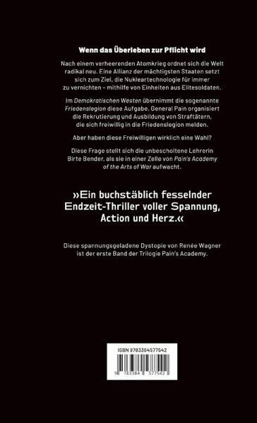 Wenn das Überleben zur Pflicht wird.Nach einem verheerenden Atomkrieg ordnet sich die Welt radikal neu. Eine Allianz der mächtigsten Staaten setzt sich zum Ziel, die Nukleartechnologie für immer zu vernichten - mithilfe von Einheiten aus Elitesoldaten.Im Demokratischen Westen übernimmt die sogenannte Friedenslegion diese Aufgabe. General Pain organisiert die Rekrutierung und Ausbildung von Straftätern, die sich freiwillig in die Friedenslegion melden.Aber haben diese Freiwilligen wirklich eine Wahl?Diese Frage stellt sich die unbescholtene Lehrerin Birte Bender, als sie in einer Zelle in Pain's Academy of the Arts of War aufwacht.Ein buchstäblich fesselnder Endzeit-Thriller voller Spannung, Action und Herz.Diese spannungsgeladene Dystopie ist der erste Band der Trilogie Pain's Academy.Was dich erwartet Eine düstere Zukunftsvision: Die Welt ordnet sich nach einem Atomkrieg politisch und wirtschaftlich neu. Aber die Menschheit kämpft noch ums Überleben. Den Frieden zwischen den Völkern zu bewahren, gestaltet sich schwierig. Immerhin einigen sich die Staaten darauf, in ihren Kriegen die Zivilisten zu schonen. Eine starke Protagonistin: Die Lehrerin Birte Bender wird in ein gnadenloses militärisches Ausbildungslager verschleppt, ihre Identität wird ausgetauscht und sie wird gezwungen, als Soldatin zu handeln und Kameraden zu führen. Doch auch als Offizierin bleibt sie Gefangene dieses unmenschlichen Systems. Moralische Dilemmata: General Pain bedroht die Leben ihres Mannes und ihrer Kinder. Um sie zu schützen, ist Birte gezwungen, als Soldatin in der Friedenslegion zu dienen. Nur ihr Gehorsam rettet ihre Familie. Obwohl Birtes schlechtes Gewissen an ihr nagt, muss sie lernen, zu töten. Doch während sie in brutalen Kriegen um ihrer aller Überleben kämpft, wächst in ihr die Sehnsucht nach Freiheit. Innere Zerrissenheit, Loyalität und Liebe: Während der gnadenlosen Ausbildung in Pain's Academy findet Birte Halt bei John - ihrem Zwangspartner, der ihr Schicksal teilt. Die beiden entwickeln gefährlich innige Gefühle füreinander. Doch Birte liebt auch ihre Familie. Für wen soll sie sich entscheiden, falls sie sich je ihre Freiheit erkämpft? Spannung und Action: Ein fesselnder Plot mit unerwarteten Wendungen, harten Kämpfen und emotionalen Szenen hält die Leserinnen und Leser in Atem.
