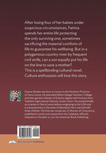 After losing four of her babies under suspicious circumstances, Fatima spends her entire life protecting the only surviving one, sometimes sacrificing the material comforts of life to guarantee his wellbeing. But in a polygamous country riven by frequent civil strife, can a son equally put his life on the line to save a mother? This is a spellbinding cultural novel. Culture enthusiasts will love this story. Hassan Baraka was born in Lunsar in the Northern Province of Sierra Leone. He attended Milton Margai Teachers' College and later gained a Master of Science degree with honours from Tashkent Agricultural Institute, Soviet Union. He worked briefly as a banker in Sierra Leone before emigrating to the USA and is a businessman in the state of Maryland. He is married with three children. His first two novels are, A Woman of Conscience, published in 2008, and Leaves from the Calabash, officially released on October 27, 2011 by American Book Publishing.