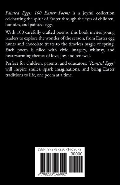 Painted Eggs: 100 Easter Poems is a joyful collection celebrating the spirit of Easter through the eyes of children, bunnies, and painted eggs. With 100 carefully crafted poems, this book invites young readers to explore the wonder of the season, from Easter egg hunts and chocolate treats to the timeless magic of spring. Each poem is filled with vivid imagery, whimsy, and heartwarming themes of love, joy, and renewal. Perfect for children, parents, and educators, "Painted Eggs" will inspire smiles, spark imaginations, and bring Easter traditions to life, one poem at a time.
