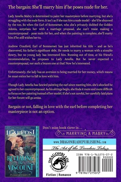 The bargain: She'll marry him if he poses nude for her. Lady Amelia Mabry is determined to paint her masterpiece before marrying, but she's struggling with the male form. It isn't as if she can hire a nude model - she'd be shunned by the ton. So when the Earl of Sommerset, who she's privately dubbed the Golden Adonis, surprises her with a marriage proposal, she can't resist making a counterproposal - pose nude for her, and when the painting is complete, she'll marry him if he still wishes her to. Andrew Crauford, Earl of Sommerset has just inherited his title - and as he's discovered, his father's significant debt. He needs to marry a woman with a sizeable dowry, but no young lady has interested him. Running out of time, at his friend's recommendation, he proposes to Lady Amelia. But he never expected a counterproposal, nor such a brazen one at that! Now he's interested. Unfortunately, the lady has an aversion to being married for her money, which means he must entice her to fall in love with him. Though Lady Amelia has fancied painting the earl since meeting him, she's shocked he agreed to her counterproposal. As his sittings begin, she finds it more and more difficult to focus on her painting instead of her model. If she's not careful, her carefully laid plans for her future will go amiss. Bargain or not, falling in love with the earl before completing her masterpiece is not an option. Marrying a Mabry Stealing the Duke Painting the Earl Revealing the Viscount