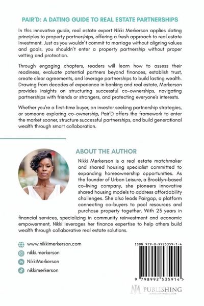 In this innovative guide, real estate expert Nikki Merkerson applies dating principles to property partnerships, offering a fresh approach to real estate investment. Just as you wouldn't commit to marriage without aligning values and goals, you shouldn't enter a property partnership without proper vetting and protection. Through engaging chapters, readers will learn how to assess their readiness, evaluate potential partners beyond finances, establish trust, create clear agreements, and leverage partnerships to build lasting wealth. Drawing from decades of experience in banking and real estate, Merkerson provides insights on structuring successful co-ownerships, navigating partnerships with friends or strangers, and protecting everyone's interests. Whether you're a first-time buyer, an investor seeking partnership strategies, or someone exploring co-ownership, Pair'D offers the framework to enter the market sooner, structure successful partnerships, and build generational wealth through smart collaboration.