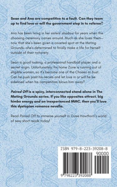 Sean and Ana are competitive to a fault. Can they team up to find love or will the government step in to referee? Ana has been living in her sisters' shadow for years when the choosing ceremony comes around. Much as she loves them--now that she's been given a coveted spot at the Mating Grounds--she's determined to finally make a life for herself outside of their notoriety. Sean is good looking, a professional handball player and a secret virgin. Unfortunately, his home Zone is running out of eligible women, so it's become one of the Chosen or bust. Can he push past his nerves and let love in or will he be sidelined when his competition blows him away? Paired Off is a spicy, interconnected stand-alone in The Mating Grounds series. If you like opposites attract, big himbo energy and an inexperienced MMC, then you'll love this dystopian romance novella. Read Paired Off to immerse yourself in Ciree Hawthorn's world of sexy short reads today!