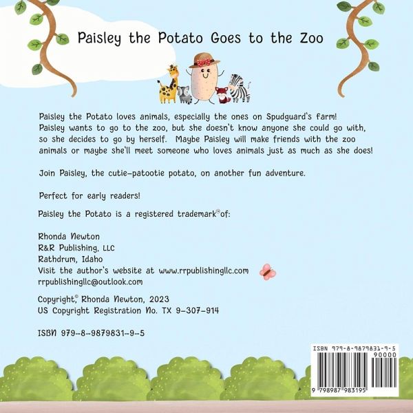 Paisley the Potato loves animals, especially the ones on Spudguard's Farm! Paisley wants to go to the zoo, but she doesn't know anyone she could go with, so she decides to go by herself. Maybe Paisley will make friends with the zoo animals or maybe she'll meet someone who loves animals just as much as she does. Join Paisley, the cutie-patootie potato, on another fun adventure. Perfect for early readers!