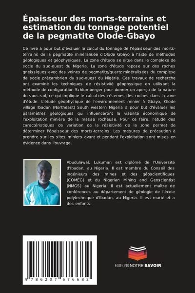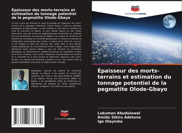 Ce livre a pour but d'évaluer le calcul du tonnage de l'épaisseur des morts-terrains de la pegmatite minéralisée d'Olode Gbayo à l'aide de méthodes géologiques et géophysiques. La zone d'étude se situe dans le complexe de socle du sud-ouest du Nigeria. La zone d'étude repose sur des roches gneissiques avec des veines de pegmatite/quartz minéralisées du complexe de socle précambrien du sud-ouest du Nigéria. Ces travaux de recherche ont examiné les techniques de résistivité géophysique en utilisant la méthode de configuration Schlumberger pour donner un aperçu de la nature du sous-sol, ce qui implique le calcul des réserves des roches dans la zone d'étude. L'étude géophysique de l'environnement minier à Gbayo, Olode village Ibadan (Northeast) South western Nigeria a pour but d'évaluer les paramètres géologiques qui influenceront la viabilité économique de l'exploitation minière de la masse rocheuse. Pour ce faire, l'étude des caractéristiques de variation de la résistivité de la zone permet de déterminer l'épaisseur des morts-terrains. Les mesures de précaution à prendre sur les sites miniers avant et pendant l'exploitation sont mises en évidence dans l'ouvrage.