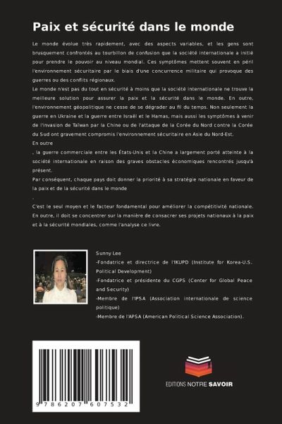 Le monde évolue très rapidement, avec des aspects variables, et les gens sont brusquement confrontés au tourbillon de confusion que la société internationale a initié pour prendre le pouvoir au niveau mondial. Ces symptômes mettent souvent en péril l'environnement sécuritaire par le biais d'une concurrence militaire qui provoque des guerres ou des conflits régionaux. Le monde n'est pas du tout en sécurité à moins que la société internationale ne trouve la meilleure solution pour assurer la paix et la sécurité dans le monde. En outre, l'environnement géopolitique ne cesse de se dégrader au fil du temps. Non seulement la guerre en Ukraine et la guerre entre Israël et le Hamas, mais aussi les symptômes à venir de l'invasion de Taïwan par la Chine ou de l'attaque de la Corée du Nord contre la Corée du Sud ont gravement compromis l'environnement sécuritaire en Asie du Nord-Est. En outre , la guerre commerciale entre les États-Unis et la Chine a largement porté atteinte à la société internationale en raison des graves obstacles économiques rencontrés jusqu'à présent. Par conséquent, chaque pays doit donner la priorité à sa stratégie nationale en faveur de la paix et de la sécurité dans le monde . C'est le seul moyen et le facteur fondamental pour améliorer la compétitivité nationale. En outre, il doit se concentrer sur la manière de consacrer ses projets nationaux à la paix et à la sécurité mondiales, comme l'analyse ce livre.