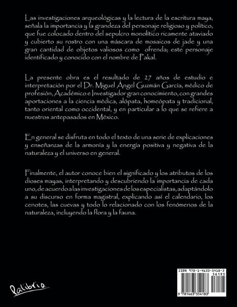 Las investigaciones arqueológicas y la lectura de la escritura maya, señala la importancia y la grandeza del personaje religioso y político, que fue colocado dentro del sepulcro monolítico ricamente ataviado y cubierto su rostro con una máscara de mosaicos de jade y una gran cantidad de objetos valiosos como ofrenda; este personaje identificado y conocido con el nombre de Pakal. La presente obra es el resultado de 27 años de estudio e interpretación por el Dr. Miguel Ángel Guzmán García, médico de profesión, Académico e Investigador gran conocimiento, con grandes aportaciones a la ciencia médica, alópata, homeópata y tradicional, tanto oriental como occidental, y en particular a lo que se refiere a nuestros antepasados en México. En general se disfruta en todo el texto de una serie de explicaciones y enseñanzas de la armonía y la energía positiva y negativa de la naturaleza y el universo en general. Finalmente, el autor conoce bien el significado y los atributos de los dioses mayas, interpretando y descubriendo la importancia de cada uno, de acuerdo a las investigaciones de los especialistas, adaptándolo a su discurso en forma magistral, explicando así el calendario, los cenotes, las cuevas y todo lo relacionado con los fenómenos de la naturaleza, incluyendo la flora y la fauna.
