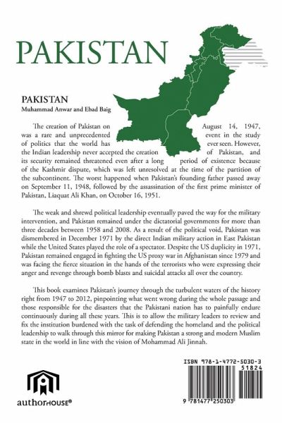 PAKISTAN Muhammad Anwar and Ebad Baig The creation of Pakistan on August 14, 1947, was a rare and unprecedented event in the study of politics that the world has ever seen. However, the Indian leadership never accepted the creation of Pakistan, and its security remained threatened even after a long period of existence because of the Kashmir dispute, which was left unresolved at the time of the partition of the subcontinent. The worst happened when Pakistan's founding father passed away on September 11, 1948, followed by the assassination of the first prime minister of Pakistan, Liaquat Ali Khan, on October 16, 1951. The weak and shrewd political leadership eventually paved the way for the military intervention, and Pakistan remained under the dictatorial governments for more than three decades between 1958 and 2008. As a result of the political void, Pakistan was dismembered in December 1971 by the direct Indian military action in East Pakistan while the United States played the role of a spectator. Despite the US duplicity in 1971, Pakistan remained engaged in fighting the US proxy war in Afghanistan since 1979 and was facing the fierce situation in the hands of the terrorists who were expressing their anger and revenge through bomb blasts and suicidal attacks all over the country. This book examines Pakistan's journey through the turbulent waters of the history right from 1947 to 2012, pinpointing what went wrong during the whole passage and those responsible for the disasters that the Pakistani nation has to painfully endure continuously during all these years. This is to allow the military leaders to review and fix the institution burdened with the task of defending the homeland and the political leadership to walk through this mirror for making Pakistan a strong and modern Muslim state in the world in line with the vision of Mohammad Ali Jinnah.