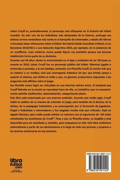 Johan Cruyff es, probablemente, el personaje más influyente en la historia del fútbol mundial. Ha sido uno de los futbolistas más destacados de la historia, prolongó esa exitosa carrera sentándose más tarde en el banquillo de entrenador, y desde allí reforzó o introdujo ideas refrescantes sobre el fútbol. No habría habido Guardiola ni Messi, ni un Barcelona 2010/2011 o una Selección Argentina 2022, por ejemplo, sin la existencia de un cruyffismo, cuyo contorno nunca puede fijarse con precisión porque esa borrosa indefinición forma parte de su dinámica. Durante casi 50 años, desde su entronización en el Ajax a mediados de los '60 hasta su muerte en 2016, Johan Cruyff fue un personaje público del fútbol. Mientras jugaba o entrenaba y pensaba, a la vez hablaba, sentando una Filosofía Cruyff. Es mucho más que un sistema o un modelo, sino una cosmogonía futbolera sin par, que brinda apoyo y soporte al sistema, que define el estilo y que, en general, proporciona respuestas a las preguntas más difíciles sobre el juego. Esa filosofía nunca logró ser articulada en una doctrina teórica única. El vendaval que Cruyff liberaba en la cancha se reprodujo fuera de ella, un torbellino que no necesariamente admitía clasificación, sistematización, categorización plena. Este libro está motorizado por una enorme ambición. Durante casi medio siglo, Cruyff habló en público de su manera de entender el juego, pero también de la técnica, de la táctica, de la pedagogía futbolística y su preocupación por la formación de jugadores. Elogió a futbolistas y entrenadores y fue elogiado mucho más que criticado. Dejó un legado fabuloso, pero nadie puede señalar un volumen con el argumento de "allí están sintetizadas las enseñanzas de Cruyff". Pese a eso, su filosofía existe, es tangible y está disponible para ser estudiada o, también, para empaparse en ella. Este libro ambiciona sistematizarla a partir de sus declaraciones a lo largo de todo ese proceso, y propone a los lectores embarcarse en esa aventura.