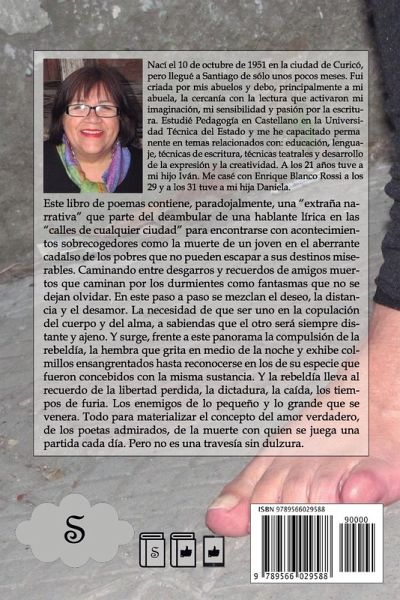 Este libro de poemas contiene, paradojalmente, una "extraña narrativa" que parte del deambular de una hablante lírica en las "calles de cualquier ciudad" para encontrarse con acontecimientos sobrecogedores como la muerte de un joven en el aberrante cadalso de los pobres que no pueden escapar a sus destinos miserables. Caminando entre desgarros y recuerdos de amigos muertos que caminan por los durmientes como fantasmas que no se dejan olvidar. En este paso a paso se mezclan el deseo, la distancia y el desamor. La necesidad de que ser uno en la copulación del cuerpo y del alma, a sabiendas que el otro será siempre distante y ajeno. Y surge, frente a este panorama la compulsión de la rebeldía, la hembra que grita en medio de la noche y exhibe colmillos ensangrentados hasta reconocerse en los de su especie que fueron concebidos con la misma sustancia. Y la rebeldía lleva al recuerdo de la libertad perdida, la dictadura, la caída, los tiempos de furia. Los enemigos de lo pequeño y lo grande que se venera. Todo para materializar el concepto del amor verdadero, de los poetas admirados, de la muerte con quien se juega una partida cada día. Pero no es una travesía sin dulzura. Surgen los hijos, los entrañables hijos de los hijos y su ternura. El amor joven que se fisgonea en un carro del metro. Sin embargo, explota la mujer loba, siempre. Para expresar que no entiende la mascarada, el reglamento, los edictos cuando en ella es más fuerte el instinto animal y la golpean los presagios. El dolor se hace presente en su danza circular y llena las páginas de imprecaciones a Dios, junto a declaraciones de pequeñez y necesidad. Son los ruidos de las calles, los murmullos del vacío, la rabia, el deseo de cambios, para culminar con el más negro humor y asegurar que para la sobrevivencia en un mundo de urgencias primarias, como comer o dormir, el poema carece de herramientas. Poemas como pasos, para andar por las calles posibles de "cualquier ciudad".