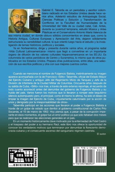 Para reconstruir la historia son muy importantes los testimonios y memorias de los protagonistas. Y Francisco «Silito» Tabernilla, oficial del Estado Mayor del Ejército Cubano y antiguo Jefe del Regimiento Mixto de Tanques y Jefe de la División de Infantería de la Ciudad Militar de Columbia, acompañó a Fulgencio Batista en las acciones que los llevaron al poder a través del golpe de estado del 10 de marzo de 1952 y hasta su huida del país el 31 de diciembre de 1958. Hoy piensa que, a pesar de la corrupción imperante en esos momentos, el golpe fue un error político ya que sólo faltaban dos meses para que se realizaran las elecciones generales en el país. Este es un libro fuerte y polémico que relata la historia, tanto política como militar, de los turbulentos años que hicieron posible la toma del poder por los Castro y seguidores. Con copia de documentos importantes y polémicas por correspondencia entre Batista, los Tabernilla y otras figuras. Con algunas fotos en blanco y negro e índice onomástico. To reconstruct history, it is important to obtain first hand information from its protagonists. Francisco "Silito" Tabernilla, chief officer in the Cuban military, accompanied Fulgencio Batista during his 1952 military coup and stayed with him until December 31, 1958 when, together, they fled the country. Today, Tabernilla believes that even with the corruption of that time, the military coup was a mistake since general presidential elections had already been scheduled. This is a powerful and controversial book that tells the story of Cuba’s turbulent years that allowed for Fidel Castro and his followers to gain permanent control. Contained are black and white photos, bibliographical references and copies of important documents and correspondence between Tabernilla and Batista, as well as other key figures.
