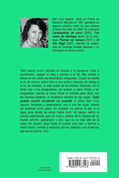 Todo puede ocurrir, perdida la mesura o el paraguas: volar a contramano, apagar el reloj y subirse a la lila más remisa o remar en los cielos de encendidos crespones. Estos poemas hablan del amor, de la vida; de las gentes comunes... de los buses y los trenes y los lugares donde la gente se busca y no se encuentra, pero se busca con más fe. Mari Cruz Agüera, con manos de tejedora urde un universo de luz, magia y encanto que atrapa al lector, quien nunca vuelve a ser el mismo después de entrar en sus predios. Pruebe y verá, el fuego o la pasión son el poema y viceversa.