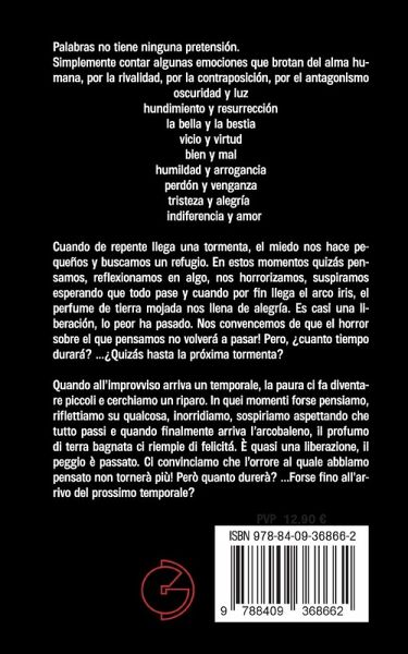 Edición bilingüe: Español - Italiano Palabras que vuelan suspiros que quedan. Páginas de poesía contemporanea con estilo minimalista. Detrás de una aparente ingenuidad en forma retórica, de vez en cuando con ironía y otras veces con desafío, versos sencillos, lineales, proponen al lector temas clásicos como el amor, la amistad, el arte, la belleza y temas sociales como la codicia, la juventud, la política, el trabajo, las desigualdades, el medioambiente. Sin ninguna pretensión y a través de estos temas, "Palabras" quiere simplemente subrayar ciertas contradicciones del ser humano, que brotan de su alma y, como un movimiento perpetuo, se suceden siempre en los siglos de la historia. Parole che volano sospiri che restano. Pagine di poesia contemporanea con stile minimalista. Dietro un'apparente ingenuitá in forma retorica, a volte con ironia altre a mò di sfida, "Palabras" con versi semplici, lineari, propone al lettore temi classici come l'amore, l'amicizia, l'arte, la bellezza e temi sociali come l'avidità, la politica, i giovani, il lavoro, le disuguaglianze, l'ambiente. Senza pretese e attraverso questi aspetti, "Palabras" vuole semplicemente sottolineare alcune contraddizioni dell'essere umano che scaturiscono dal suo animo e, come un movimento perpetuo, si avvicendano sempre nei secoli della storia.
