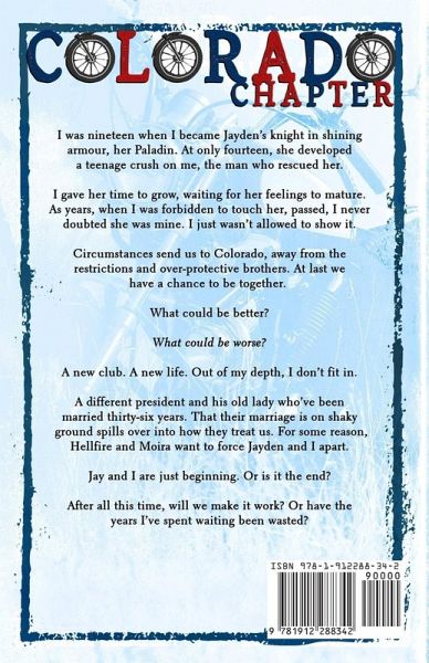 I was nineteen when I became Jayden’s knight in shining armour, her Paladin. At only fourteen, she developed a teenage crush on me, the man who rescued her. I gave her time to grow, waiting for her feelings to mature. As years, when I was forbidden to touch her, passed, I never doubted she was mine. I just wasn’t allowed to show it. Circumstances send us to Colorado, away from the restrictions and over-protective brothers. At last we have a chance to be together. What could be better? What could be worse? A new club. A new life. Out of my depth, I don’t fit in. A different president and his old lady who’ve been married thirty-six years. That their marriage is on shaky ground spills over into how they treat us. For some reason, Hellfire and Moira want to force Jayden and I apart. Jay and I are just beginning. Or, is it the end? After all this time, will we make it work? Or have the years I’ve spent waiting been wasted?