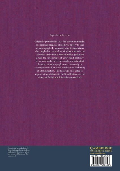 Originally published in 1915, this book was intended to encourage students of medieval history to take up palaeography by demonstrating its importance when applied to certain historical documents in the collection of the Public Records Office. Jenkinson details the various types of 'court hand' that may be seen on medieval records, and emphasises that the study of palaeography must necessarily be accompanied with an equal emphasis on the history of administration. This book will be of value to anyone with an interest in medieval history and the history of British administrative conventions.