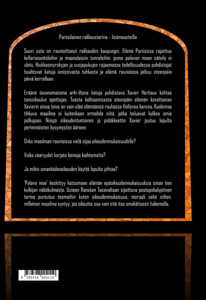 Pariisilainen rakkaustarina - lisämausteilla Suuri sota on raunioittanut rakkauden kaupungin. Elämä Pariisissa rajoittuu kellariasuntoloihin ja maanalaisiin tunneleihin, jonne palavan maan säteily ei ulotu. Hiukkasmyrskyjen ja suojapukujen rajaamassa todellisuudessa puhdistajat huuhtovat katuja ionisoivasta tuhkasta ja elämä raunioissa jatkuu eteenpäin päivä kerrallaan. Eräänä tavanomaisena arki-iltana katuja puhdistava Xavier Herbaux kohtaa tanssikoulun opettajan. Tuosta kohtaamisesta eteenpäin elämän kovettaman Xavierin ainoa toive on vain elää elämäänsä rauhassa Hollynsa kanssa. Kuolemaa tihkuva maailma ei kuitenkaan armahda niitä, jotka haluavat kulkea omia polkujaan. Niinpä oikeudentuntoinen ja pidäkkeetön Xavier joutuu lopulta perimmäisten kysymysten ääreen: Onko maailman raunioissa vielä sijaa oikeudenmukaisuudelle? Voiko vääryydet korjata keinoja kaihtamatta? Ja mihin omankädenoikeuden käyttö lopulta johtaa? 'Palava maa' keskittyy katsomaan elämän epäoikeudenmukaisuuksia oman tien kulkijan näkökulmasta. Uuteen Ranskan Tasavaltaan sijoittuva postapokalyptinen tarina pureutuu teemoihin kuten oikeudenmukaisuus, moraali sekä siihen, millainen maailma syntyy, jos oikeutta saa vain sitä itse omakätisesti hakemalla. Lisätietoja kirjailijasta ja lukunäytteet kirjasta www.jackandolini.com