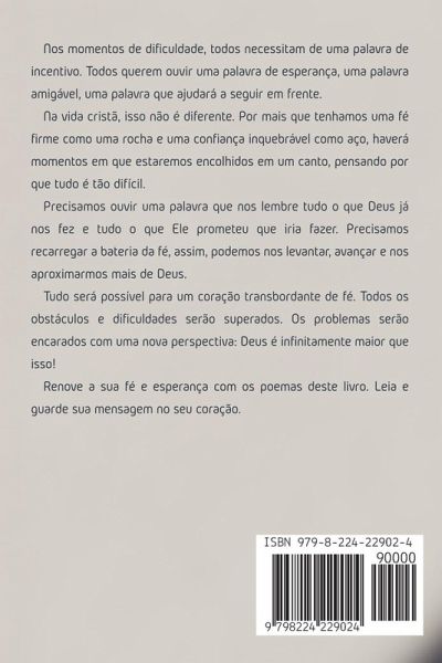 Nos momentos de dificuldade, todos necessitam de uma palavra de incentivo. Todos querem ouvir uma palavra de esperança, uma palavra amigável, uma palavra que ajudará a seguir em frente. Na vida cristã, isso não é diferente. Por mais que tenhamos uma fé firme como uma rocha e uma confiança inquebrável como aço, haverá momentos em que estaremos encolhidos em um canto, pensando por que tudo é tão difícil. Precisamos ouvir uma palavra que nos lembre tudo o que Deus já nos fez e tudo o que Ele prometeu que iria fazer. Precisamos recarregar a bateria da fé, assim, podemos nos levantar, avançar e nos aproximarmos mais de Deus. Tudo será possível para um coração transbordante de fé. Todos os obstáculos e dificuldades serão superados. Os problemas serão encarados com uma nova perspectiva: Deus é infinitamente maior que isso! Renove a sua fé e esperança com os poemas deste livro. Leia e guarde sua mensagem no seu coração.