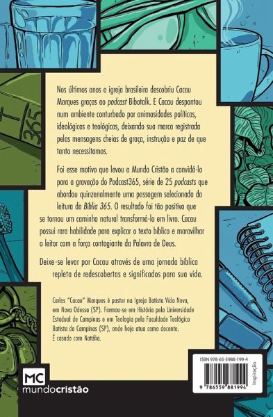 Nos últimos anos a igreja brasileira descobriu Cacau Marques graças ao podcast Bibotalk. E Cacau despontou num ambiente conturbado por animosidades políticas, ideológicas e teológicas, deixando sua marca registrada pelas mensagens cheias de graça, instrução e paz de que tanto necessitamos. Foi esse motivo que levou a Mundo Cristão a convidá-lo para a gravação do Podcast365, série de 25 podcasts que abordou quinzenalmente uma passagem selecionada da leitura da Bíblia 365. O resultado foi tão positivo que se tornou um caminho natural transformá-lo em livro. Cacau possui rara habilidade para explicar o texto bíblico e maravilhar o leitor com a força contagiante da Palavra de Deus. Deixe-se levar por Cacau através de uma jornada bíblica repleta de redescobertas e significados para sua vida.