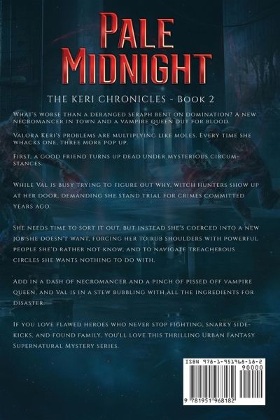 What's worse than a deranged seraph bent on domination? A new necromancer in town and a vampire queen out for blood. Valora Keri's problems are multiplying like moles. Every time she whacks one, three more pop up. First, a good friend turns up dead under mysterious circumstances. While Val is busy trying to figure out why, witch hunters show up at her door, demanding she stand trial for crimes committed years ago. She needs time to sort it out, but instead she's coerced into a new job she doesn't want, forcing her to rub shoulders with powerful people she'd rather not know, and to navigate treacherous circles she wants nothing to do with. Add in a dash of necromancer and a pinch of pissed off vampire queen, and Val is in a stew bubbling with all the ingredients for disaster. If you love flawed heroes who never stop fighting, snarky sidekicks, and found family, you'll love this thrilling Urban Fantasy Supernatural Mystery series.