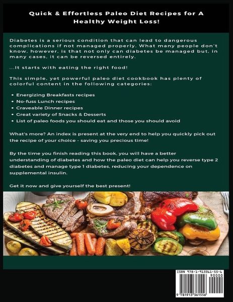 Quick & Effortless Paleo Diet Recipes For A Healthy Weight Loss In 2019! Following a healthy and nutritious diet is important for everyone, but particularly so for people who are already suffering from chronic diseases like diabetes Diabetes is a serious condition that can lead to dangerous complications if not managed properly. What many people don't know, however, is that not only can diabetes be managed but, in many cases, it can be reversed entirely. ...It starts with eating the right food! Type 2 diabetes is very closely associated with weight, with over 90% of newly diagnosed type 2 diabetics above their ideal weight. Losing some weight could both prevent you from developing diabetes, or help you to better manage your condition if you have already been diagnosed with diabetes. That's why I focused on creating the one and only paleo diet cookbook that you'll ever need to achieve this goal and effectively manage your diabetes! This simple, yet powerful paleo diet cookbook has plenty of colorful content in the following categories: Energizing Breakfasts recipes No-fuss Lunch recipes Craveable Dinner recipes Great variety of Snacks & Desserts List of paleo foods you should eat and those you should avoid What's more? An index is present at the very end to help you quickly pick out the recipe of your choice - saving you precious time! By the time you finish reading this book, you will have a better understanding of your diabetes and how the paleo diet can help you reverse type 2 diabetes and manage type 1 diabetes. This complete Paleo diet cookbook will take care of your scarce cooking time and will show you the easiest & tastiest way towards a PERMANENT WEIGHT-LOSS & New Life. Get it now and give yourself the best present!