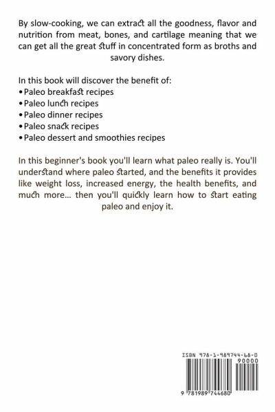 By slow-cooking, we can extract all the goodness, flavor and nutrition from meat, bones, and cartilage meaning that we can get all the great stuff in concentrated form as broths and savory dishes. In this book will discover the benefit of: ¿ Paleo breakfast recipes ¿ Paleo lunch recipes ¿ Paleo dinner recipes ¿ Paleo snack recipes ¿ Paleo dessert and smoothies recipes In this beginner's book you'll learn what paleo really is. You'll understand where paleo started, and the benefits it provides like weight loss, increased energy, the health benefits, and much more... then you'll quickly learn how to start eating paleo and enjoy it.
