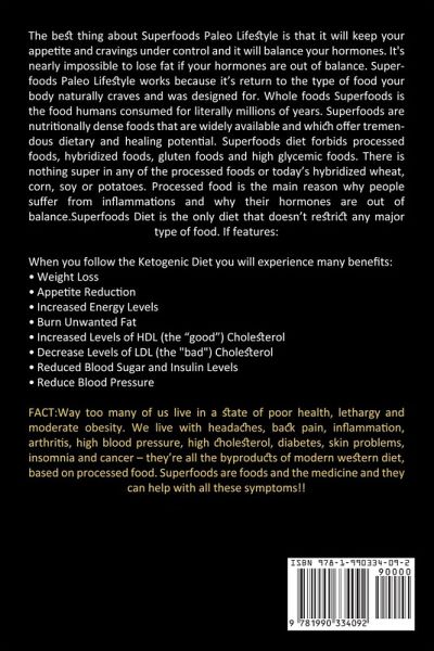 The best thing about Superfoods Paleo Lifestyle is that it will keep your appetite and cravings under control and it will balance your hormones. It's nearly impossible to lose fat if your hormones are out of balance. Superfoods Paleo Lifestyle works because it's return to the type of food your body naturally craves and was designed for. Whole foods Superfoods is the food humans consumed for literally millions of years. Superfoods are nutritionally dense foods that are widely available and which offer tremendous dietary and healing potential. Superfoods diet forbids processed foods, hybridized foods, gluten foods and high glycemic foods. There is nothing super in any of the processed foods or today's hybridized wheat, corn, soy or potatoes. Processed food is the main reason why people suffer from inflammations and why their hormones are out of balance.Superfoods Diet is the only diet that doesn't restrict any major type of food. If features: When you follow the Ketogenic Diet you will experience many benefits: · Weight Loss · Appetite Reduction · Increased Energy Levels · Burn Unwanted Fat · Increased Levels of HDL (the "good") Cholesterol · Decrease Levels of LDL (the "bad") Cholesterol · Reduced Blood Sugar and Insulin Levels · Reduce Blood Pressure FACT:Way too many of us live in a state of poor health, lethargy and moderate obesity. We live with headaches, back pain, inflammation, arthritis, high blood pressure, high cholesterol, diabetes, skin problems, insomnia and cancer - they're all the byproducts of modern western diet, based on processed food. Superfoods are foods and the medicine and they can help with all these symptoms!!