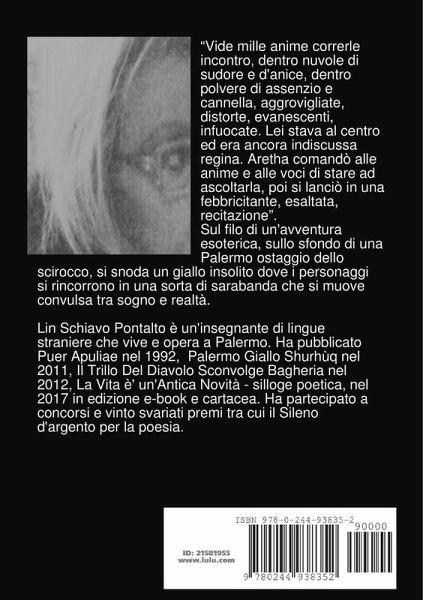 "Vide mille anime correrle incontro, dentro nuvole di sudore e d'anice, dentro polvere di assenzio e cannella, aggrovigliate, distorte, evanescenti, infuocate. Lei stava al centro ed era ancora indiscussa regina. Aretha comandò alle anime e alle voci di stare ad ascoltarla, poi si lanciò in una febbricitante, esaltata, recitazione". Sul filo di un'avventura esoterica, sullo sfondo di una Palermo ostaggio dello scirocco, si snoda un giallo insolito dove i personaggi si rincorrono in una sorta di sarabanda che si muove convulsa tra sogno e realtà. Lin Schiavo Pontalto è un'insegnante di lingue straniere che vive e opera a Palermo. Ha pubblicato Puer Apuliae nel 1992, Palermo Giallo Shurhùq nel 2011, Il Trillo Del Diavolo Sconvolge Bagheria nel 2012, La Vita è' un'Antica Novità - silloge poetica, nel 2017 in edizione e-book e cartacea. Ha partecipato a concorsi e vinto svariati premi tra cui il Sileno d'argento per la poesia.