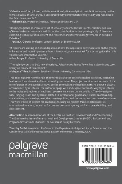 This book explores how the rule of power relates to the case of occupied Palestine, examining features of local dissent and international governance. The project considers expressions of the rule of power in two particular ways: settler colonialism and neoliberalism. As power is always accompanied by resistance, the authors engage with and explores forms of everyday resistance to the logics and regimes of neoliberal governance and settler colonialism. They investigate wide-ranging issues and dynamics related to international governance, liberal peacebuilding, statebuilding, and development, the claim to politics, and the notion and practice of resistance. This work will be of interest for academics focusing on modern Middle Eastern politics, international relations, as well as for courses on contemporary conflicts, peacebuilding, and development.