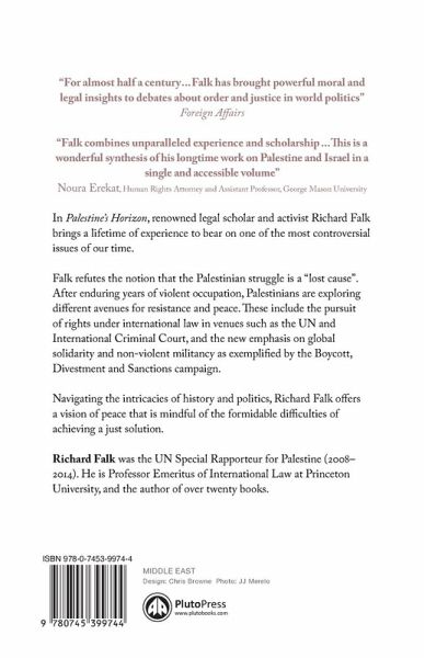 Richard Falk, former UN Special Rapporteur for Palestine (2008-2014), has dedicated much of his life to the study of the Israel/Palestine conflict. In Palestine's Horizon, he brings his experiences to bear on one of the most controversial issues of our times. This book explores the intricacies and interconnections of the history and politics of Israel/Palestine, in light of the global community's troubled morality. After enduring years of violent occupation, the Palestinian movement is exploring different avenues for peace. These include the pursuit of rights under international law in venues such as the UN and International Criminal Court, and the new emphasis on global solidarity and non-violent militancy embodied by the Boycott, Divestment and Sanctions Campaign, among others. Falk refutes the notion that the Palestinian struggle is a 'lost cause' by focusing on new tactics of resistance. He also reflects on the legacy of Edward Said, drawing on the importance of his humanist thought. Against this background, he provides a vision of peace that is mindful of the formidable difficulties of achieving a just solution to the long conflict.