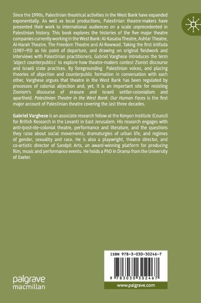 Since the 1990s, Palestinian theatrical activities in the West Bank have expanded exponentially. As well as local productions, Palestinian theatre-makers have presented their work to international audiences on a scale unprecedented in Palestinian history. This book explores the histories of the five major theatre companies currently working in the West Bank: Al-Kasaba Theatre, Ashtar Theatre, Al-Harah Theatre, The Freedom Theatre and Al-Rowwad. Taking the first intifada (1987-93) as his point of departure, and drawing on original fieldwork and interviews with Palestinian practitioners, Gabriel Varghese introduces the term 'abject counterpublics' to explore how theatre-makers contest Zionist discourse and Israeli state practices. By foregrounding Palestinian voices, and placing theories of abjection and counterpublic formation in conversation with each other, Varghese argues that theatre in the West Bank has been regulated by processes of colonial abjection and, yet, it is an important site for resisting Zionism's discourse of erasure and Israeli settler-colonialism and apartheid. Palestinian Theatre in the West Bank: Our Human Faces is the first major account of Palestinian theatre covering the last three decades.
